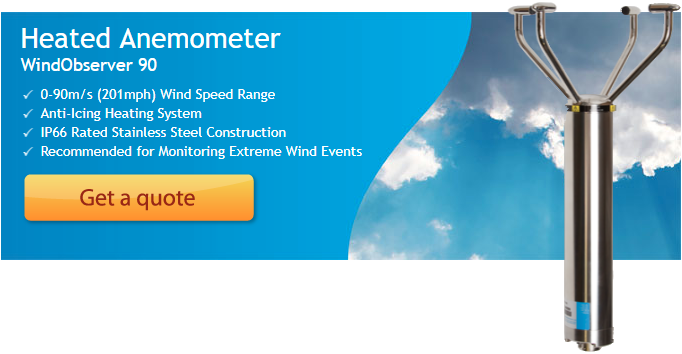 The WindObserver 90 has been developed for measuring the highest wind speeds in extreme weather environments such as typhoons and hurricanes and is available with optional heating. The sensor provides data via RS422/RS485 bidirectional link, which allows several units to be networked together and data logged on demand.