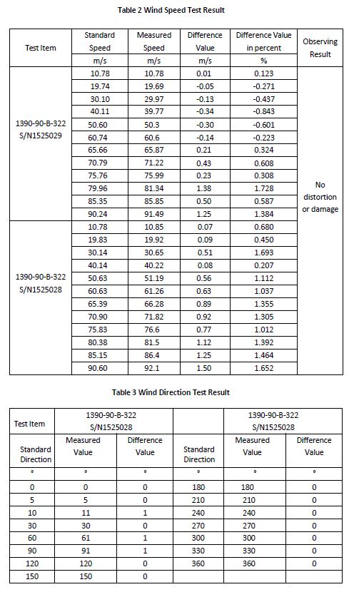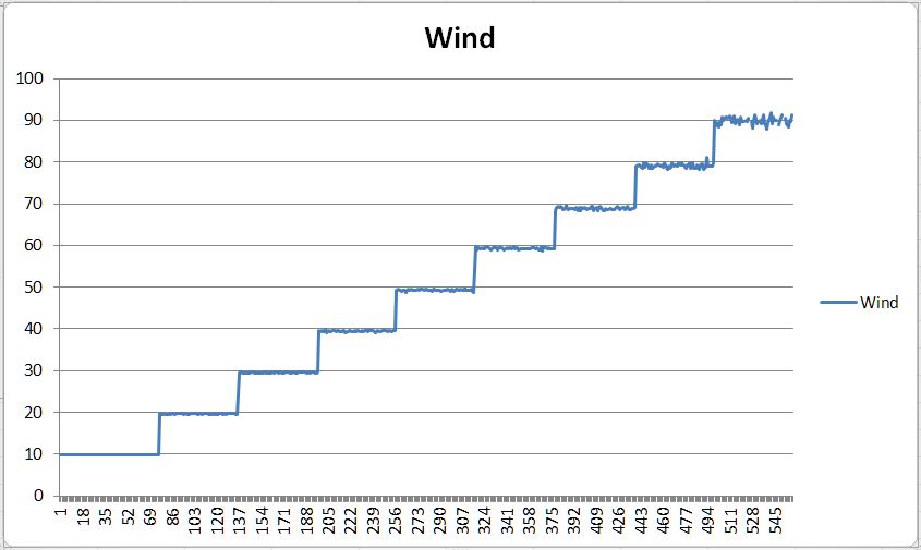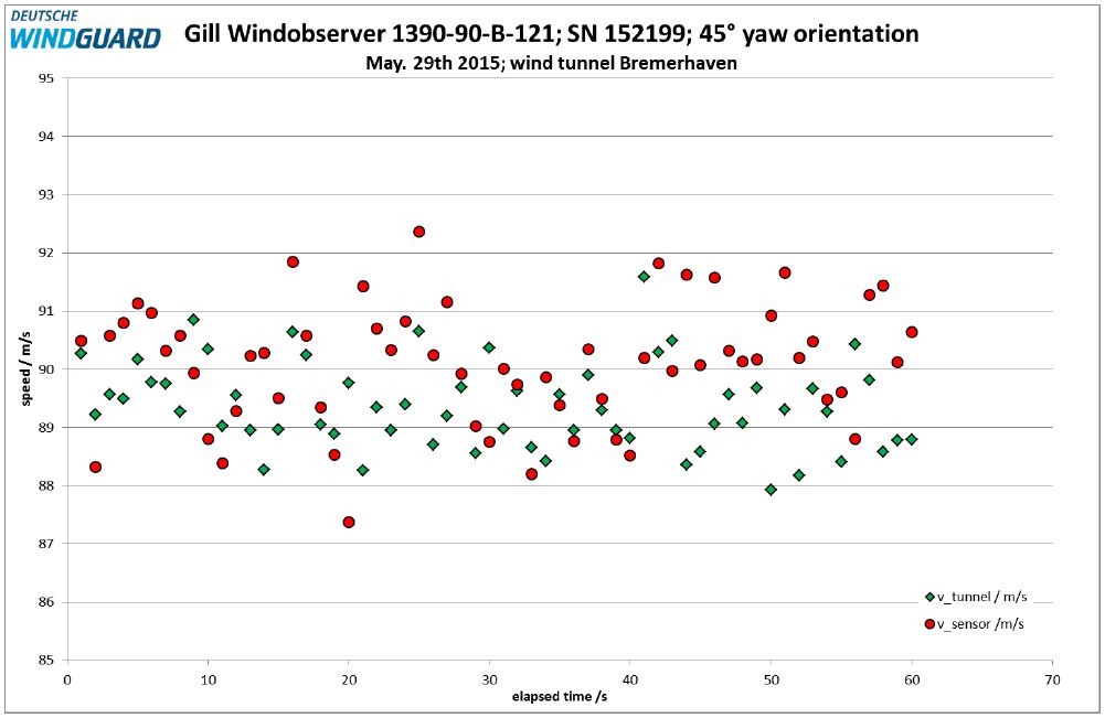 Below is an example of the excellent performance of the WO90 sensor as recently tested in the independent third party Deutsche WindGuard high speed tunnel in Bremerhaven, Germany. The graph shows the tunnel speed with some minor variations around 90 m/s with the WO90 producing very accurate data at this speed with errors no larger than +/- 2 m/s (roughly 2%) at this new benchmark for high speed wind sensing.